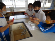 4年生は,理科室で実験をすることが増えてきました。今日は「水は,あたためたり,冷やしたりすると,体積が変わるのだろうか。」という問題を解決するために,計画を立てて実験を行いました。水の体積が変わっていくのを見て,感動しました。